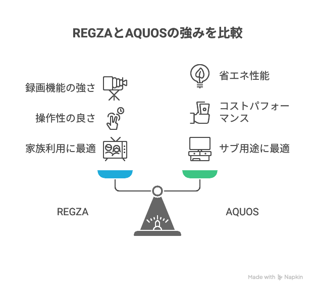 👉 こうして並べてみると「録画を重視するならREGZA」「コスパや省エネを重視するならAQUOS」という棲み分けが自然と見えてきます。